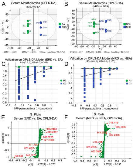 OPLS-DA score plots and the permutation tests of serum metabolomic profile with the identified metabolites displayed in the groups. OPLS-DA models of (A) ERD vs. EA, p < 0.001 and (B) NRD vs. NEA, p < 0.001. The permutation test on the OPLS-DA of (C) ERD vs. EA and (D) NRD vs. NEA. The S-plots based on OPLS-DA of (E) ERD vs. EA and (F) NRD vs. NEA and identified metabolites in serum. All p-values were estimated using the CV-ANOVA test. Ellipse in the OPLS-DA panels represents Hotelling’s T2 test with a confidence interval of 0.95. The counts of permutation tests are 999.