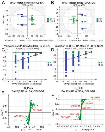 OPLS-DA score plots and the permutation tests of BALF metabolomic profile with the identified metabolites displayed in the groups. OPLS-DA models of (A) ERD vs. EA, p < 0.001 and (B) NRD vs. NEA, p < 0.001. The permutation test on the OPLS-DA of (C) ERD vs. EA and (D) NRD vs. NEA. The S-plots based on OPLS-DA of (E) ERD vs. EA and (F) NRD vs. NEA and identified metabolites in BALF. All p-values were estimated using the CV-ANOVA test. Ellipse in the OPLS-DA panels represents Hotelling’s T2 test with a confidence interval of 0.95. The counts of permutation tests are 999.
