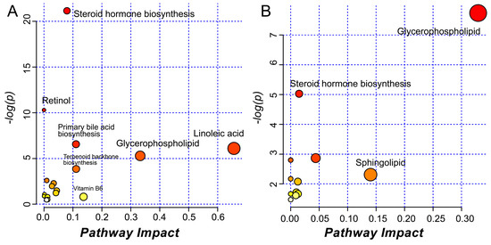 Perturbed metabolic pathways of (A) Serum and (B) BALF from MetaboAnalyst 4.0.