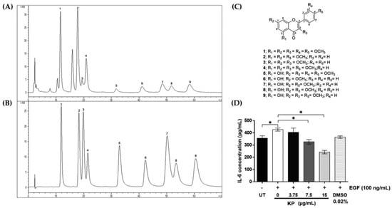 2.1. Chemical Profile of Methoxyflavones in KP Extract and Effects of KP on IL-6 Production