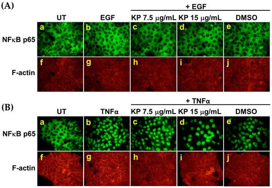 2.3. EGF has no Effects on Nuclear Factor Kappa B (NF-κB) Activation in HeLa Cells, and the Suppression of IL-6 Production by KP is not Regulated through NF-κB Inhibition