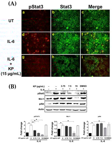 2.6. KP Inhibits IL-6-Induced STAT3 Activation and Expression of the Anti-Apoptotic Protein Mcl-1