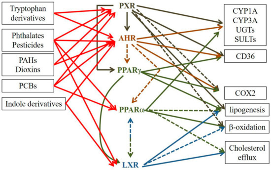Selected examples of crosstalk between PXR, AHR, PPARs and LXRs. Plain lines designate an activation, whereas dotted lines designate an inhibition.