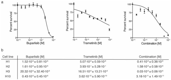Cell survival curves of cells grown as monolayers after treatment with buparlisib, trametinib or a combination with increasing drug concentrations (0.000001 μM–100 μM). (a) representative graphs of H1 cells treated with increasing drug concentrations for 72 h, with either buparlisib, trametinib, or combined treatment; (b) table showing the IC50 doses, the doses at which 50% of the cells were growth inhibited, for all four cell lines studied. The experiments were performed in triplicate (n = 6 per experiment per drug concentration).