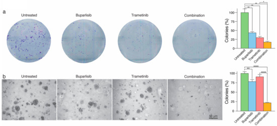 Only H1 cells grew as colonies in a 3D anchorage-independent culture environment. H1 cells pre-treated with trametinib and grown in the same conditions covered in comparison around 91.0% of the field of view. Cells treated with buparlisib covered around 78.4% of the total area (p < 0.01, compared to untreated cells), while the area covered after combined treatment was around 22.1% (p < 0.0001, compared to untreated cells; Figure 3).