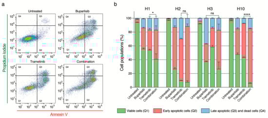 To assess whether the altered morphology could indicate apoptosis, we studied this by flow cytometry using a PI and annexin V assay after treating the cells for 72 h (Figure 5). Combination treatment reduced cell viability across all four cell lines, by entering early or late apoptosis (Figure 5). For untreated H1 cells, around 94% of the cells were viable (Figure 5a,b). Single drug treatment decreased the number of viable cells to around 55%, while combined treatment decreased the number of viable cells to around 40%. Approximately 10% of the H2 cells survived after trametinib treatment, and almost 30% of the cells were healthy after being exposed to buparlisib. Combined treatment resulted in a 7% cell survival (Figure 5b). For the H3 cell line, cell survival after exposure to single drug treatment was around 58% (trametinib) and 37% (buparlisib). In addition, here, combined treatment effectively reduced cell survival, compared to monotherapies to around 25% (Figure 5b). Between 40–50% of H10 cells treated with single drugs survived the treatment. Here, combined drug treatment effectively reduced the number of healthy cells to approximately 6% (Figure 5b). For H1, H2 and H10, trametinib was the most effective monotherapy. For H3 cells, buparlisib was the most effective monotherapy.