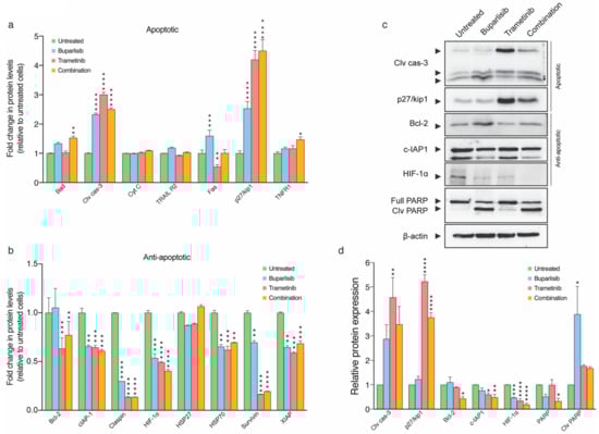 A selection of key apoptotic and anti-apoptotic proteins identified from the apoptosis array (Figure 6a,b) was then verified by quantitative Western blot analyses (Figure 6c,d). Statistically significant increases in protein levels of cleaved caspase-3 were found for lysates from H1 cells treated with trametinib (p < 0.01). Increased expression of p27/kip1 was seen for cells treated with trametinib and combination therapy (both p < 0.0001). Statistically significant decreases were also detected for Bcl-2 in the combination group (p < 0.05) and for HIF-1α across buparlisib, trametinib and combination group (p < 0.001, 0.0001 and 0.0001, respectively). PARP, which is considered a hallmark of apoptosis, was also downregulated in the combination group (p < 0.05; Figure 6c,d).