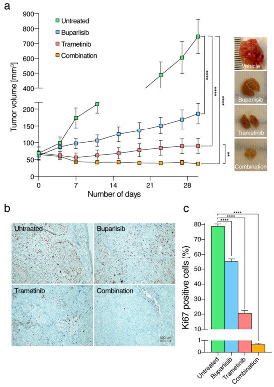 Inhibition of in vivo tumor growth after treatment with 50 mg/kg buparlisib and 1 mg/kg trametinib. (a) tumor volumes plotted as a function of time to assess tumor growth in response to therapy. The tumors were measured once a week and at the end-point of the experiment (30 days). Representative images of subcutaneous tumors after termination of the experiment can be seen on the right (n = 8 mice in each treatment group); (b) immunohistochemistry sections from representative mice from each treatment group stained with antibodies against Ki67 (imaged with a 10× objective); (c) quantification of the number of Ki67 positive cells in each treatment group. Abbreviations: **: p < 0.01 and ****: p < 0.0001.