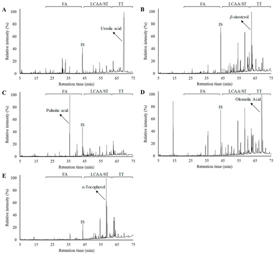 Gas chromatography–mass spectrometry (GC–MS) chromatograms of the derivatized lipophilic extracts from V. vinifera vine wastes: (A) unripe grapes, (B) vine shoots, (C) vine canes, (D) grape stalks, and (E) leaves. FA—fatty acids, LCAA—long chain aliphatic alcohols, ST—sterols, TT—triterpenoids, IS—internal standard. For each chromatogram, the major component was highlighted.