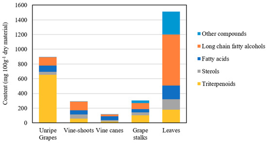 Viticulture has experienced an impressive global growth in acreage and value; however, substantial amounts of organic and inorganic waste are generated throughout the value chain, representing remarkable ecologic and economic waste management issues and challenges [5]. Currently, the concept of sustainable viticulture requires that the sector optimizes the available resources to improve environmentally responsible viticulture [6], emphasizing the urgent need to move towards more sustainable grape culture and wine production practices [5]. Nonetheless, viticulture still generates about 5 tons of solid waste per hectare annually during cultivation and harvesting [7]. Vineyard management often implies cane and vine-shoot pruning, leaf trimming and cluster thinning, mainly to address wine industry requirements, aiming to obtain wines with better sensorial quality. The generated waste includes grape stalks, unripe grapes, vine shoots, vine canes and leaves. Nonetheless, grape pomace is the main solid organic waste from winery industries and is the reason why most of the research is focused on this matrix [5], with the wastes mentioned above remaining largely unexploited. In fact, few efforts have been made to find ways to add value to these wastes, which can be an endless source of bioactive phytochemicals [8]. In addition, most of the research dealing with wastes from viticulture and wine-making processes has been focused on phenolic compounds (nearly 40% of the literature reports [9]), although other relevant families of compounds—e.g. sterols or triterpenes—also have remarkable bioactivities, and thus contribute to their valorisation. The presence of some of these compounds has been already reported in V. vinifera morphological parts, such as grapes [10] and stalks [11], although an integrated characterization of their lipophilic fraction including different families of compounds (i.e., fatty acids, long-chain aliphatic alcohols, sterols or triterpenes) is not available in the literature.