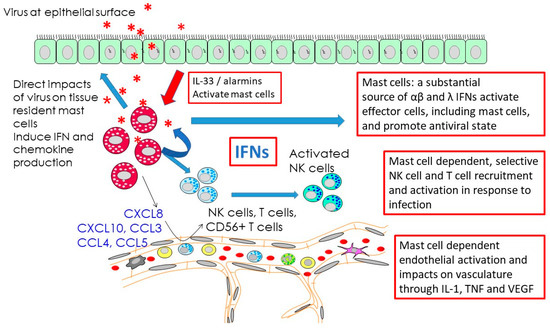 Selected, critical and early mast cell (MC) responses to viral infections which occur without a requirement for MC degranulation. MCs can be activated directly by active viral infection or by contact with viral particles. They can also be activated by alarmins released as a result of infection of neighboring or epithelial cells. This MC activation leads to the production of multiple mediators including large amounts of type I interferons (IFNs) and type III IFNs by virus infected human cells. While inducing an antiviral state in neighboring cells, such IFN responses also initiate multiple additional responses (blue arrows), the expression of a number of chemokines which together with MC-derived cytokines enhance the local recruitment of effector cells such as NK cells, T cells, and CD56-positive T cells from local blood vessels and promote the activation of NK cells, enhancing their cytotoxic functions. Such IFNs also act in an autocrine fashion to further promote selected mediator production by MCs. MC mediators, in several infections, would also act to enhance lymph node hypertrophy and mobilize local dendritic cell populations promoting the development of a subsequent acquired immune response.