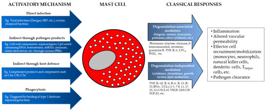 Mast cells can recognize and respond to pathogens either directly through pathogen infection, or indirectly through an array of pathogen products, host defense mechanisms, or phagocytosis. Activation results in the secretion of classical mast cell mediators that can be categorized as degranulation-dependent or degranulation-independent. These mediators contribute to the inflammation and changes to the site of pathogen infections, recruitment of other immune cell types, and regulation of the immune response to pathogens.