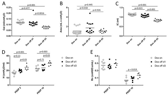 Data describing lung mechanical function are detailed in Figure 1. The quasi-static compliance (Cst) is the slope of the deflation limb of a quasi-static PV-loop at an airway opening pressure of 5 cmH2O and was significantly reduced in Dox off d3 compared to both the Dox on and the Dox off d1 groups (Figure 1A). However, a difference regarding this parameter was not observed between Dox on and Dox off d1. Quasi-static PV-loops were further investigated and the hysteresis (= area within the PV loop) was determined (Figure 1B). While hysteresis in Dox off d1 was significantly increased compared to Dox on this was not the case considering Dox off d3. Inspiratory capacity (IC) is defined as the volume of displaced air into the lung during a ramp inflation from 3 to 30 cmH2O over a period of 6 s. Unlike Cst, IC showed a significant decrease in Dox off d1 compared to Dox on (Figure 1C). Dox off d3 was characterized by an even more dramatic reduction in IC compared to Dox on and Dox off d1 (Figure 1C).