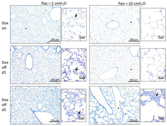 Microatelectases. Representative light microscopic images of Dox on, Dox off d1 and Dox off d3 of lung tissue fixed at end-expiratory airway opening pressure (Pao) of 2 and 10 cmH2O. The arrows indicate piled septal walls due to microatelectases which can be observed at Pao = 2 cmH2O in all study groups, while at Pao = 10 cmH2O microatelectases are present in Dox off d3 but not Dox on or Dox off d1. In addition, the alveolar ducts appear enlarged in some regions (asterisk) in Dox off d3 at Pao = 10 cmH2O. Arrow: microatelectasis; asterisk: alveolar duct.