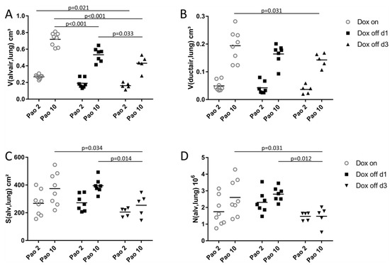 Figure 2 illustrates representative light microscopic images of the study groups fixed by vascular perfusion at different end-expiratory airway opening pressures (Pao 2 cmH2O and 10 cmH2O). At the time point of fixation the lungs were air-filled so that the air-liquid interface was present and the effects of interfacial surface tension on lung structure could be investigated [26,35]. In general, the blood vessels including the capillary network within the interalveolar septa were free of blood cells and open so that it can be concluded that the perfusion fixation was successful. At lower magnification there were no apparent differences between Dox on (Figure 2) and Dox off d1. At higher magnification both study groups demonstrated signs of collapsed alveoli (microatelectases) and formation of pleats of interalveolar septal walls at Pao = 2 cmH2O which disappeared at Pao = 10 cmH2O. On contrary, microatelectases were present at both Pao = 2 cmH2O and Pao = 10 cmH2O in Dox off d3. Moreover, the alveolar ducts were widened while the interalveolar septa appeared to be piled up at Pao = 10 cmH2O (Figure 2).