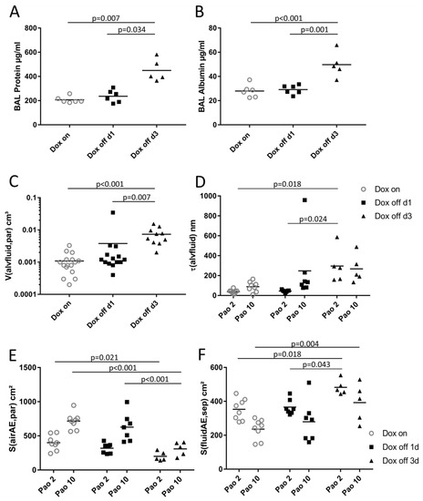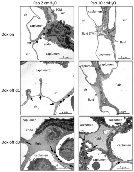 At ultrastructural level, the main difference between Dox off d3 and the other two groups was the dramatic increase in the volume of alveolar fluid per lung (Figure 5C). This increase was accompanied by higher BAL concentrations of protein and albumin (Figure 5A,B). The protein level in BAL fluid increased by the factor 2.2 (Figure 5A) while the stereological parameter, the absolute volume of alveolar fluid, increased by the factor 8.1 (Figure 5C). During vascular perfusion fixation of the lung for electron microscopy glutaraldehyde crosslinks the proteins which are located in the alveolar fluid so that the fluid becomes visible. In Dox off d3 the alveolar fluid was much darker in some areas of the lung compared to Dox on so that it can be concluded that the fluid was enriched with proteins. Taking the 8.1-fold increase in the volume of alveolar fluid into account the increase in BAL protein levels appears to be disproportionally low. While the stereological parameter is unbiased taking also the reference space into account, this is not the case regarding the protein level in BAL since the recovery of BAL fluid varied between 2 and 2.5 mL. Moreover, it can be speculated that during broncho-alveolar lavage the derecruited and edema filled distal airspaces could not be opened so that only recruitable parts were reached. This would result in a higher degree of dilution of alveolar proteins in Dox off d3 and therefore an underestimation of the increase in the amount of proteins within the alveolar space since for all lungs the same volume of fluid was instilled into the lungs.
