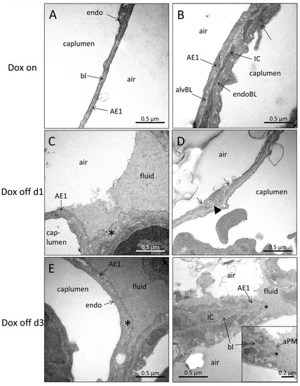 The increase in BAL albumin in Dox off d3 can be attributed to disruption of the blood-gas barrier consisting of the alveolar epithelial cells, the basal lamina (= interstitium) and the endothelial cells. Previous studies have shown that the surfactant dysfunction in this animal model is present at 1 day after doxycycline withdrawal and remains consistent through day four [21]. High surface tension, moreover, has been shown to result in interfacial stress linked to injury of alveolar epithelial cells [22,36,37]. In order to understand whether Dox off d1 group shows in absence of elevated BAL protein alveolar epithelial injury the further ultrastructural investigation focused on alveolar epithelial cells. There were no obvious alterations in the ultrastructure of AE2 cells including the morphology of lamellar bodies. However, subtle abnormalities were observed regarding the AE1 cells. In Dox off d1 AE1 cells occasionally showed swelling and clearing of the cytoplasmic ground substance (Figure 6C). In healthy controls the AE1 cells were usually not swollen and the cytoplasmic ground substance was characterized by the same density as the endothelial cells or interstitial cells (Figure 6A,B). Furthermore, there were signs of rupture of the apical plasma membrane of AE1 cells in Dox off d1 (Figure 6D). Ruptures of the apical plasma membrane, swelling, and clearing of cytoplasmic ground substance were also observed in Dox off d3 AE1 cells (Figure 6E,F).