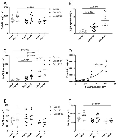 Hence, a quantification of alveolar epithelial injury was performed (Table 4 and Figure 7). The total surface area of the alveolar epithelial basal lamina S(alvBL,sep) was found to increase with Pao (Figure 7A). This observation can be explained by Pao-induced stretching of alveolar septal walls. The surface fraction of the basal lamina covered either by injured epithelial cells SS(AEinjure/alvBL), healthy appearing AE1 cells SS(AE1/alvBL), or healthy appearing AE2 cells SS(AE2/alvBL) was determined in order to describe injury severity. Surface fractions were independent of Pao effects and influenced by group assignment. Dox off d1 showed increased SS(AEinjure/alvBL); the injured fraction increased further in Dox off d3 (Figure 7B). This increase in SS(AEinjure/alvBL) occurred in concert with decreased SS(AE1/alvBL) while SS(AE2/alvBL) remained stable (Table 4). In order to avoid the reference trap, the surface fractions and S(alvBL,sep) were used to calculate absolute values of basal lamina covered by injured epithelial cells [S(AEinjure,sep)], AE1 cells S(AE1,sep) and AE2 cells S(AE2,sep). S(AEinjure,sep) and S(AE1,sep) were greater at higher Pao (Figure 7C,F). Moreover, S(AEinjure,sep) increased progressively from Dox on to Dox off d1 and Dox off d3 (Figure 7C). In order to describe the relationship between V(alvfluid,par) and S(AEinjure,sep) these data were plotted against each other. Since Pao influenced S(AEinjure,sep) this relationship was investigated for Pao = 2 cmH2O (Figure 7D). The distribution of points argued against a linear relationship. Hence, curve fitting was tested for an exponential or second order quadratic relationship between these two parameters using GraphPad PRISM statistic software (Version 7). The best curve fitting was achieved by an exponential growth equation: