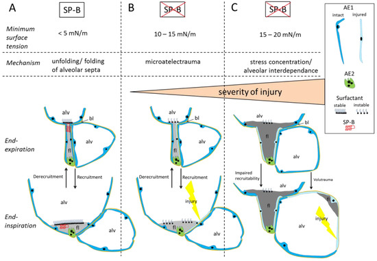 Clinical studies demonstrated that a reduction in the SP-B level in the alveolar space represents an early event during the time course and can even precede the development of the complete clinical picture of ARDS [14,15]. In established ARDS, moreover, the level of SP-B in broncho-alveolar lavage fluid (BAL) correlated convincingly with the impairment in surfactant function as characterized by the minimum surface tension [16]. However, in the context of clinical ARDS, the relevance of this early SP-B reduction has not been investigated in detail although it has been suggested that surfactant inactivation plays a central role in the development of ARDS [17]. It is well known that high surface tension leads to edema formation [18] and expiratory alveolar derecruitment [19]. In the conditional SP-B knockout mouse model high surface tension results in pulmonary inflammation, respiratory failure and death [20,21]. However, the mechanisms leading to respiratory failure in SP-B deficiency-induced high surface tension are not entirely understood. Several models of pulmonary micromechanics offer realistic scenarios by which SP-B deficiency induced high surface tension can result in progressive lung injury [22,23,24,25]. The failure of surfactant to reduce surface tension during expiration results in alveolar instability with derecruitment of alveolar surface area or even complete alveoli which can be recruited if transpulmonary pressure gradients increase again during inspiration [26]. This repetitive intratidal alveolar recruitment/derecruitment has been observed in lavage models of acute lung injury during mechanical ventilation [12]. There is evidence that repetitive recruitment/derecruitment of distal airspaces can be harmful to the alveolar epithelium thereby contributing to ventilation-induced lung injury (VILI) via a mechanism known as atelectrauma [27]. Computational modelling combined with experimental validation in cell culture model systems provided evidence that the opening of a fluid-occluded distal airspace can, in the presence of high surface tension, be associated with potential harmful pressure gradients acting on the epithelial lining [22]. Accordingly, restoring surfactant function and reducing surface tension protected the epithelial lining in models of fluid occluded distal airspace recruitment [22,28]. It has also been shown that the properties of the air-liquid interface are critical for the function of AE2 cells because the surface tension forces exert deforming mechanical stresses (e.g., shear stress and tensile strain) on the AE2 cells [23,24,29]. As a result AE2 cells change gene expression profiles in a way that resembles VILI, cyclic alveolar stretch, and pulmonary fibrosis [23].
