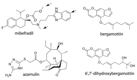 - Lin, H.L.; Kenaan, C.; Hollenberg, P.F. Identification of the residue in human CYP3A4 that is covalently modified by bergamottin and the reactive intermediate that contributes to the grapefruit juice effect. Drug Metab. Dispos. 2012, 40, 998–1006. [Google Scholar] [CrossRef] [PubMed]