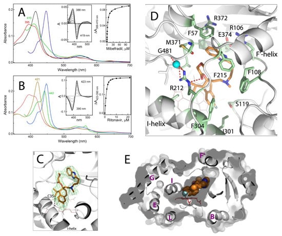 Spectral and structural properties of the CYP3A4-mibefradil complex. (A,B) Spectral changes observed during equilibrium titrations of CYP3A4 with mibefradil and upon displacement of mibefradil with ritonavir, respectively. In panel (A), the spectrum of ligand-free CYP3A4 is in black. In panel (B), the spectrum of ritonavir-bound CYP3A4 is in brown. In both panels, the spectra of the CYP3A4-mibefradil complex and its ferrous and ferrous CO-bound forms are in red, green and blue, respectively. In the competitive displacement experiment (panel B), the concentration of mibefradil was 120 μM. The left and right insets are the difference spectra and titration plots with hyperbolic fittings, respectively. The derived Ks values are given in Table 1. (C) The active site of CYP3A4 bound to mibefradil (shown in orange sticks; PDB ID 6OO9). Green mesh is a polder omit electron density map contoured at 3σ level. Simulated annealing omit map for mibefradil is shown in Figure S2A. The labeled C35 atom of mibefradil is the closest to the heme iron (~3.8 Å away). (D) Interaction of mibefradil with surrounding residues (shown in green sticks and labeled). Red dotted lines are H-bonds. Cyan sphere is a water molecule. (E) A slice through the CYP3A4 molecule showing how well mibefradil (in space-filling representation) fits into the active site cavity. The visible helices are labeled.