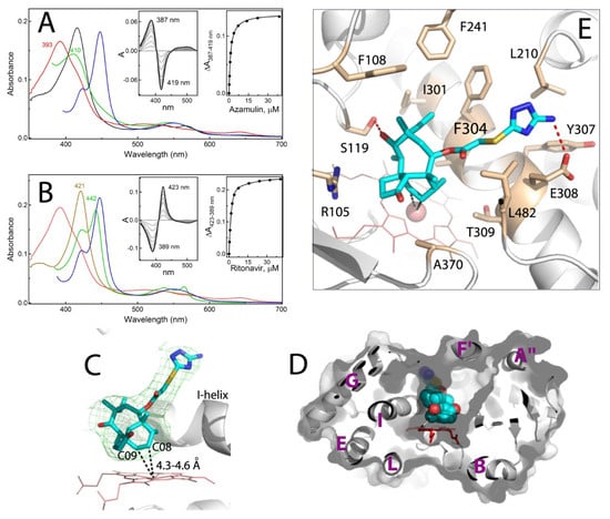 Spectral and structural properties of the CYP3A4-azamulin complex. (A,B) Spectral changes observed during equilibrium titrations of CYP3A4 with azamulin and upon displacement of azamulin with ritonavir, respectively. In panel (A), the spectrum of ligand-free CYP3A4 is in black. In panel (B), the spectrum of ritonavir-bound CYP3A4 is in brown. In both panels, the spectra of the CYP3A4-azamulin complex and its ferrous and ferrous CO-bound forms are in red, green and blue, respectively. In the competitive displacement experiment (panel B), the concentration of azamulin was 60 μM. The left and right insets are the difference spectra and titration plots with hyperbolic fittings, respectively. The derived Ks values are listed in Table 1. (C) The binding mode of azamulin (in cyan; PDB ID 6OOA). Green mesh is a polder omit electron density map contoured at 3σ level. Simulated annealing omit map for azamulin is shown in Figure S2B. The closest to the iron C08 and C09 atoms are indicated. (D) A slice through the CYP3A4 molecule showing that azamulin (in space-filling representation) extends over the I-helix rather than along the substrate channel. The visible helices are labeled. (E) Interaction of azamulin with surrounding residues (shown in beige sticks and labeled). The H-bonds are depicted as red dotted lines.