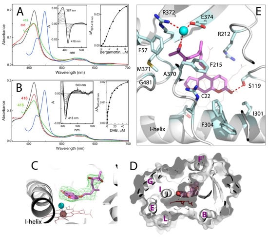 Interaction of CYP3A4 with bergamottin and DHB. (A,B) Spectral changes observed during equilibrium titration of CYP3A4 with bergamottin and 6′,7′-dihydroxybergamottin (DHB), respectively. The spectra of ligand-free CYP3A4 are in black. The spectra of the CYP3A4-substrate complexes and their ferrous and ferrous CO-bound forms are in red, green and blue, respectively. The left and right insets are the difference spectra and titration plots with sigmoidal and hyperbolic fittings, respectively. The derived Ks values are listed in Table 1. (C) The binding mode of DHB (in magenta; PDB ID 6OOB). Green mesh is a polder omit electron density map contoured at 3σ level. Simulated annealing omit map for DHB is shown in Figure S2C. Cyan sphere is the heme-bound water molecule. (D) A slice through the CYP3A4 molecule showing how DHB (in space-filling representation) orients in the active site cavity. The visible helices are labeled. (E) Interaction of DHB with surrounding residues (shown in cyan sticks and labeled). Red dotted lines are H-bonds. Cyan sphere is a water molecule. The furan double bond, a possible bioactivation site, is indicated by an arrow. The C22 atom of psoralen’s phenyl ring, the closest to the heme iron, is labeled.