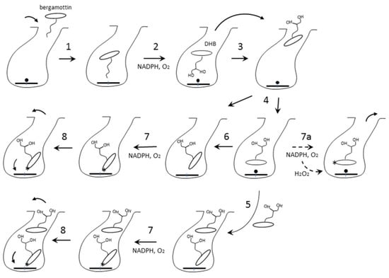 To reconcile our and the previous results [22,23], we propose the following mechanism (Figure 5). Having a more hydrophobic aliphatic chain, bergamottin preferably enters the active site with the geranyl being the closest to the heme iron (step 1), as observed in the 6DWM structure of CYP1A1 [24]. This binding mode is productive and leads to formation of DHB and singly hydroxylated products (step 2). Being more hydrophilic, the oxidation products would dissociate and reenter the active site with the psoralen group approaching the heme (steps 3–4). This orientation could enable association of the second DHB molecule, which may alter the conformation of DHB bound to the high-affinity site (step 5). Occupation of both binding sites would enhance the inhibitory potential, as furanocoumarin dimers are known to inhibit CYP3A4 stronger than DHB [21,25,26]. Nonetheless, the higher-affinity ligands could fully displace DHB and, thus, its metabolic activation would be a prerequisite for the potent inhibition. Among multiple DHB orientations, only some would be suitable for the enzymatic bioactivation of the furan ring (steps 6–7). Alternatively, since CYP3A4 catalysis is highly uncoupled [27], the furan double bond could be oxidized by a by-product, hydrogen peroxide, even when DHB adopts the crystallographic binding mode (step 7a). Upon epoxidation and opening of the furan ring, the radical intermediate could attack the heme (step 8). The epoxide product, in turn, could diffuse out of the active site and modify the apoprotein [22]. This could lead to alterations in conformational dynamics and structural integrity of CYP3A4 and its accelerated degradation [28].