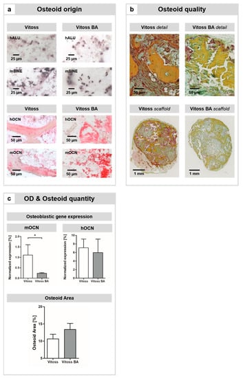 Impact of BG particles on osteoid formation, maturation, and osteogenic cell differentiation (OD). (a) In both scaffold types, hybrid osteoid formation was detectable: The presence of murine and human cells was confirmed by in-situ hybridization for species-specific human repetitive genetic sequences, so-called short interspersed nucleotide elements (SINEs; murine: mSINE; human: hALU); positively stained cells appear in dark violet. Scale bars refer to 25 µm. Furthermore, human osteocalcin (hOCN) and murine osteocalcin (mOCN) were present in the osteoid, thus cells of both species committed to osteoid formation. Scale bars refer to 50 µm. (b) Qualitatively, osteoid maturation was further advanced in the Vitoss group, whilst slightly more osteoid was present in the Vitoss BA scaffolds (c). Scale bars refer to 50 µm for the detail view and 1 mm for the scaffold view, respectively. (c) Expression patterns of mOCN and hOCN as markers of osteogenic differentiation were assessed. (*) indicates significant differences.
