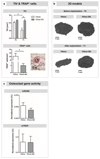 BG that is added as a second phase to CaP-based bone substitute materials can influence the resorption kinetics of the CaP; however, this has not yet been described for Vitoss and Vitoss BA [,,]. Therefore, the changes in volume during the implantation period were quantified by mCT. The presence of tartrate-resistant acid phosphatase positive (TRAP+) cells as an important part of in vivo implant degradation was quantified as well.