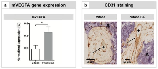 VEGFA gene expression was significantly (p = 0.015) upregulated in the Vitoss BA group (Figure 3a). Correlates of vascularization were qualitatively visualized by CD31 staining. CD31 was detectable in endothelial cells encompassing lumina in both scaffold types (Figure 3b).