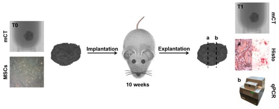Figure 4 provides an overview over the methods used within this study. After production, the scaffolds were scanned by mCT (T0) and finally seeded with MSCs before implantation in SCID mice. After 10 weeks, scaffolds were explanted and subjected to a second mCT scan (T1) before embedding in paraffin. The paraffin-embedded specimens were analyzed in different section planes using histomorphometry and qPCR.