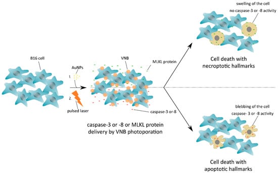 Induction of cell death with necroptotic or apoptotic hallmarks after mixed-lineage kinase domain-like (MLKL) protein or caspase-3/-8 delivery by vapor nanobubble (VNB) photoporation, respectively. B16 cells are first incubated with gold nanoparticles (AuNPs) that adsorb onto the plasma membrane, followed by a nanosecond pulsed laser treatment that results in the formation of vapor nanobubbles (VNBs). Collapse of the expanding VNBs leads to membrane pore formation and allows the extracellular MLKL or caspase -3/-8 protein to diffuse into the cell cytoplasm. After a short period of incubation, the MLKL protein has evoked cell death with necroptotic hallmarks, whereas transduced caspase-3/-8 protein results in apoptosis.