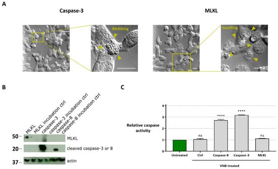 Characterization of cell death modality after protein transfection. (A) Differential interference contrast light microscopy visualization of the cell morphology 30 min after caspase-3 and MLKL protein transduction (scale bars = 20 µm). (B) Western blot analysis of caspase-3, caspase-8 and MLKL protein in B16 cell lysates with or without (ctrl) VNB photoporation. MLKL, caspase-3, caspase-8 were probed simultaneously using an anti-His detection antibody (exposure 30 min). Actin was visualized using an anti-actin antibody (exposure time 5 min). The cropped blots are presented here, and their full-length blots are included in Supplementary Figure S1. (C) Caspase activity in lysates of cells that were transduced with MLKL, caspase-3 or caspase-8 by VNB photoporation. Statistical differences between relative caspase activity in the different samples were determined relative to the untreated control. **** p < 0.0001; ns = non-significant (one-way ANOVA with Dunett’s multiple comparison test).