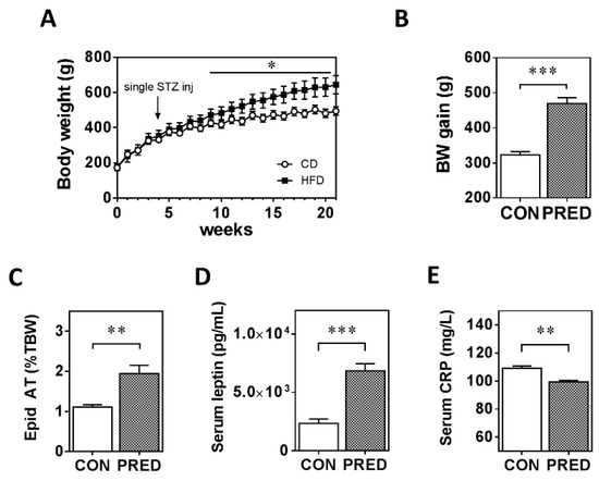 2.1. Twenty Weeks of HFD with a Single Low-Dose of STZ Induced Obesity with Prediabetes, Adipose Tissue Remodelling but Preserved Liver Function in Long-Evans Rats