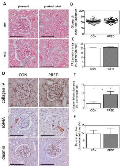 2.2. Renal Function was Preserved but Significant Glomerular Collagen Deposition and Tubular Lcn2 Expression Appeared in PRED Rats