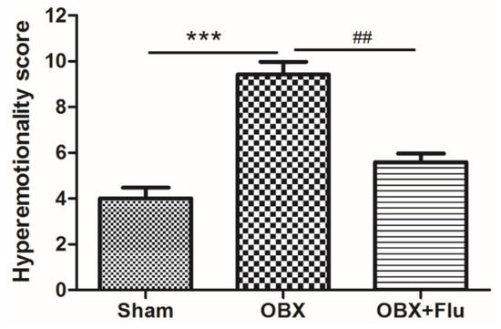 The effects of OBX and fluoxetine treatment on the hyperemotionality score in rats. *** p < 0.001 compared to the sham group. ## p < 0.01 compared to the OBX group (means ± SEM, n = 8). Flu, fluoxetine. OBX, olfactory bulbectomy.