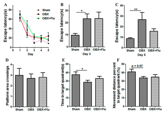 Effects of OBX and fluoxetine treatment on spatial memory of rats in the Morris water maze (MWM) test. (A) The latency to the hidden platform during the five-day navigation test. (B,C) The escape latency recorded on day 3 and day 5, respectively. On day 6, the platform was withdrawn. (D) Platform area crossings. (E) Time spent in the target quadrant. (F) Movement distance percent in the target quadrant. * p < 0.05, ** p < 0.01 compared to the sham group (means ± SEM, n = 8). Flu, fluoxetine. OBX, olfactory bulbectomy.