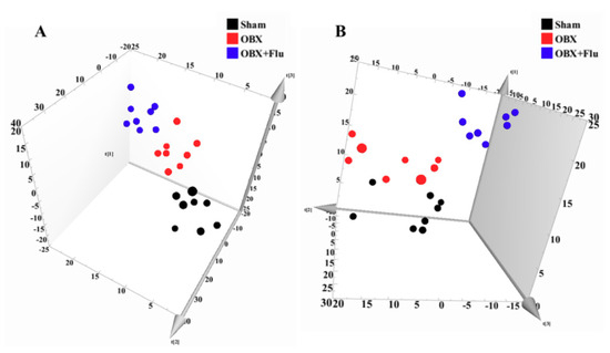 3D-PCA score plots of hippocampus samples from sham (black), OBX (red), and OBX + Flu groups (blue) assayed by the UPLC-QTOF-MS in positive (A) and negative (B) ionization modes, respectively (n = 8). Flu, fluoxetine. OBX, olfactory bulbectomy.