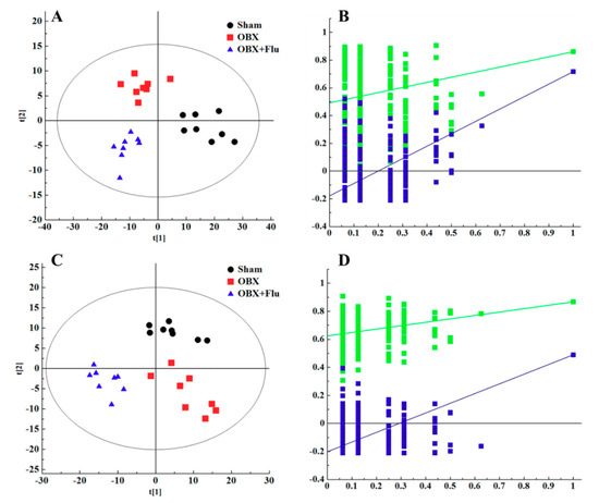 PLS-DA score plots of hippocampus samples from sham group (black), OBX group (red), and OBX + Flu group (blue) in a positive ionization mode (A), (R2X = 0.281, R2Y = 0.853, Q2 (cum) = 0.484) and negative ionization mode (C), (R2X = 0.236, R2Y = 0.805, Q2 (cum) = 0.516) (n = 8). The results of 200 permutations in PLS-DA models showed that R2 (green square) and Q2 (blue square) values in the intercept of the Y-axis (bottom left) were significantly lower than their corresponding original R2 and Q2 values (top right) in a positive ionization mode (B), (R2 = 0.492, Q2 = −0.178) and a negative ionization mode (D), (R2 = 0.625, Q2 = −0.202), respectively. Flu, fluoxetine. OBX, olfactory bulbectomy.
