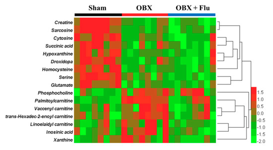 Heat map of identified biomarkers in the hippocampus of OBX rats. Red and green represent that the levels of potential biomarkers are higher and lower compared to the average level, respectively. Rows imply the potential biomarkers and columns represent hippocampus samples of rats (n = 8 in each group). Flu, fluoxetine. OBX, olfactory bulbectomy.