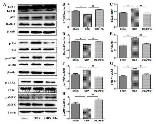 Effects of OBX and fluoxetine treatment on the expression of proteins associated with autophagy in the hippocampus of rats. (A) Representative protein bands. (B–H) The relative grey values of LC3 II/β-actin, p62/β-actin, beclin1/β-actin, p-Akt/Akt, p-mTOR/mTOR, p-ULK1/ULK1, and p-AMPK/AMPK. * p < 0.05, ** p < 0.01 compared to the sham group. # p < 0.05, ## p < 0.01 compared to the OBX group (mean ± SEM, n = 4). Flu, fluoxetine. OBX, olfactory bulbectomy.