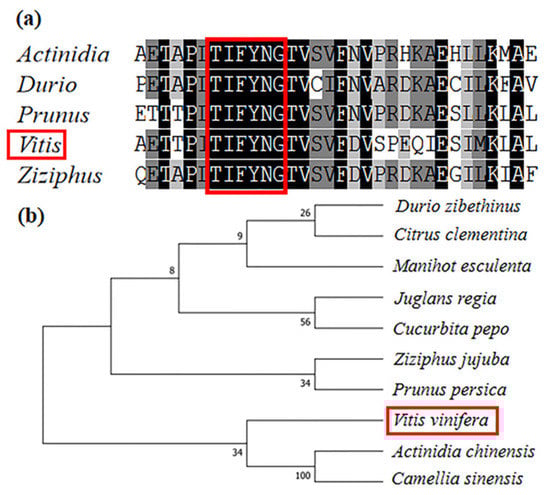 Sequence analysis of VvTIFY9. (a) Sequence alignment of the core TIF[F/Y]XG motif conserved motifs from different plant species. The core TIF[F/Y]XG motif (Right) of VvTIFY9 are shown in red frame. (b) The phylogenetic relationship of TIFY9 and its closely related homologs from Vitis vinifera (Gene ID XP_002262750.1), Citrus clementina (Gene ID XP_006438845.1), Ziziphus jujuba (Gene ID XP_015902294.1), Durio zibethinus (Gene ID XP_022727087.1), Actinidia chinensis (Gene ID PSS12092.1), Prunus persica (Gene ID XP_007223954.2), Juglans regia (Gene ID XP_018859193.1), Manihot esculenta (Gene ID XP_021619798.1), Cucurbita pepo (Gene ID XP_023547598.1), and Camellia sinensis. (Gene ID XP_028072909.1).