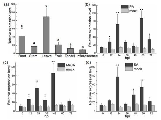 The qRT-PCR analysis of VvTIFY9 gene expression in grape (Vitis vinifera L. cv. Jingxiu). (a) The relative expression of VvTIFY9 in grape root, stem, leaf, fruit, tendril, and inflorescence tissue types, respectively. (b) VvTIFY9 expression in pathogen (PA)-treated plants and normal plants; Jingxiu leaves were infected with Erisiphe necator and control leaves (mock) were sprayed with sterile water. (c) VvTIFY9 expression in methyl jasmonate (MeJA)-treated plants and normal plants; leaves were treated with 100 mM of MeJA. (d) VvTIFY9 expression in salicylic acid (SA)-treated plants and normal plants; leaves were treated with 10 mM SA. The control leaves (mock) in (c) and (d) were sprayed with 0.05% (v/v) Tween 20. Expression levels in (b), (c), and (d) were measured every 12 h, for which leaves were collected at different time points as indicated. VvAct was as the internal control. Means ± SDs of three independent experiments. Asterisks indicate statistically significant differences vis-à-vis the corresponding control. (* p < 0.05, ** p < 0.01; Student’s t-test).