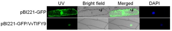 To investigate the subcellular localization of VvTIFY9, a fused gene (pBI221-GFP/VvTIFY9) was transiently introduced into the onion epidermal cells. Expression of GFP alone showed a signal in the nucleus of the onion epidermal cells. Similarly, the GFP signal from epidermal cells expressing pBI221-GFP/VvTIFY9 was also localized to the nucleus (Figure 3).