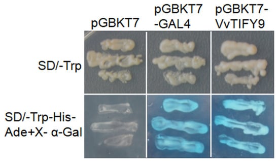 Transcriptional activation analysis of VvTIFY9 in yeast. The full coding sequence of VvTIFY9 was fused into pGBKT7 in frame to generate the pGBKT7-VvTIFY9 structure. Then pGBKT7-GAL4 encoding full-length GAL4 and empty vector pGBKT7 were used as the positive and negative controls, respectively. Yeast were grown on a nonselective medium (SD/-Trp) and selective medium (SD/-Trp-His-Ade+X-α-Gal) plates, incubated at 30 °C for three days before their examination.