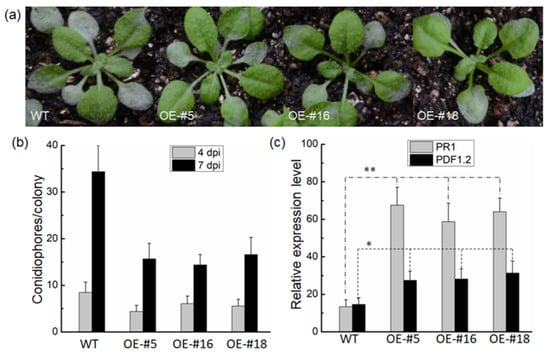 To distinguish and confirm the specific resistance function of VvTIFY9 against powdery mildew disease, an overexpression construct of VvTIFY9 driven by the CaMV-35S was transformed into Arabidopsis plants. Three transgenic Arabidopsis lines (OE-#5, OE-#16, and OE-#18) were obtained to investigate VvTIFY9′s role in basal resistance to powdery mildew, with wild-type plants serving as the control. The content of powdery mildew fungus in wild-type Arabidopsis was significantly higher than that in the overexpressing lines (Figure 5a). Further, quantitative analysis of powdery mildew fungus in these wild-type plants and overexpressing lines showed that the latter’s content of conidiophores was significantly lower than the former’s (Figure 5b). PDF1.2 and PR1 are key signal molecules in JA and SA signal transduction pathways, respectively [14,15]. Comparing the relative expression levels of PR1 and PDF1.2 between wild-type plants and overexpressing lines revealed the latter had significantly higher PR1 expression (Figure 5c).