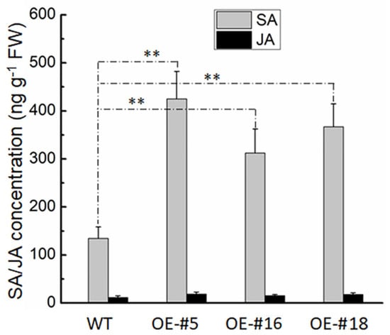 To test whether VvTIFY9 is involved in the biosynthesis of plant endogenous hormones, we determined the SA and JA concentration in VvTIFY9 transgenic plants and the wild type. As Figure 6 shows, the SA content of overexpressing plants was significantly higher than that of wild-type plants, whereas no significant difference was found for their JA content.