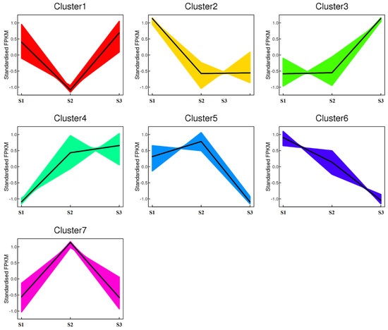 To identify the DEGs during the common buckwheat seed development, the gene expression profile clustering was subjected to first analysis. All 54,582 genes were assigned to seven different clusters by the K-means method, which led to the identification of genes with similar expression during all stages of seed development, and indicated that a large number of genes were differentially expressed between different samples (Figure 1).