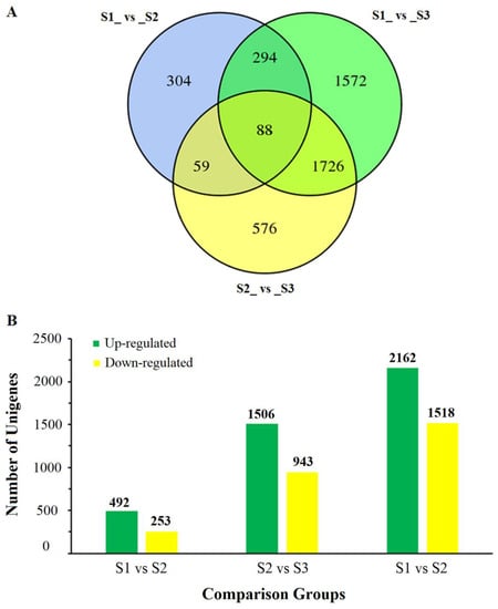 Numbers of specific differentially expressed genes (DEGs) in different comparison groups during common buckwheat seed development. (A) Venn diagram for DEGs at different development stages of common buckwheat. (B) Numbers of up- and down-regulated DEGs in different comparison groups. S1, S2, and S3 stand for the seed samples at pre-filling stage, filling stage, and initial maturity stage, respectively.